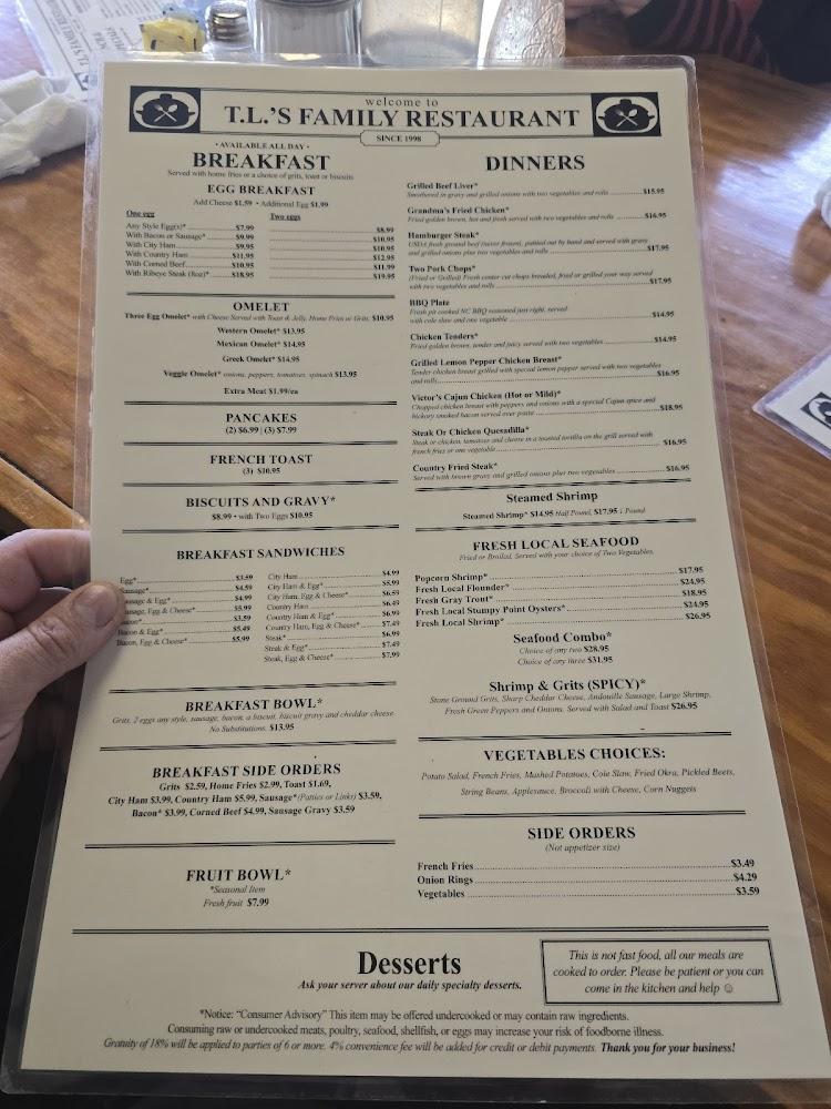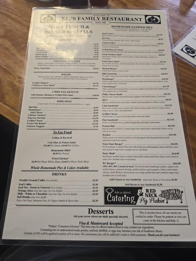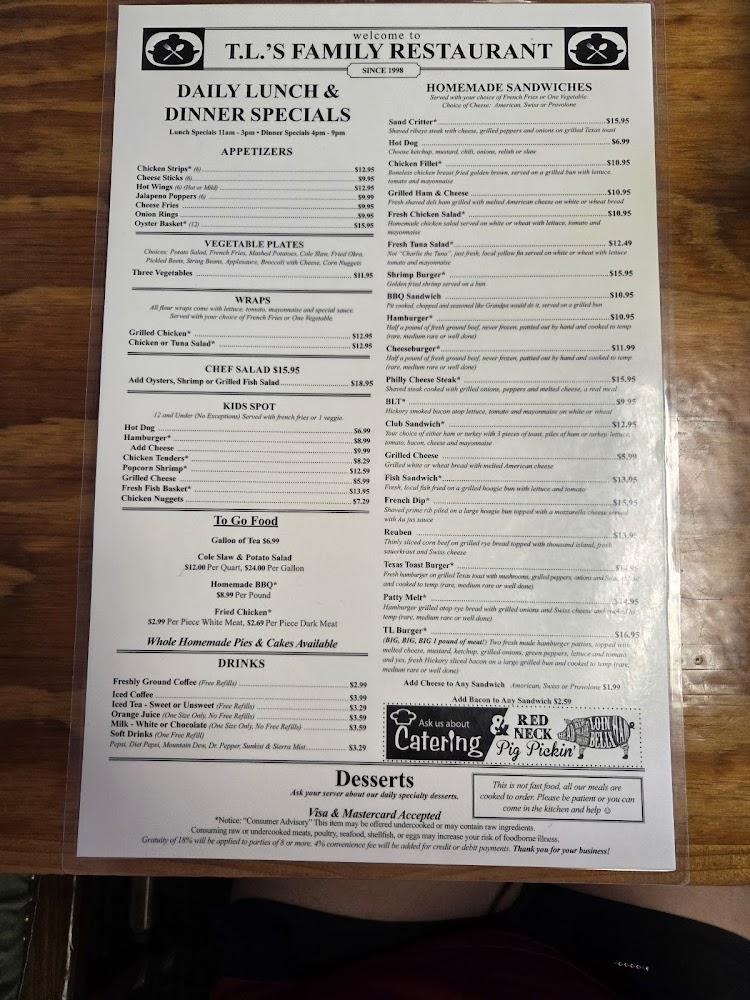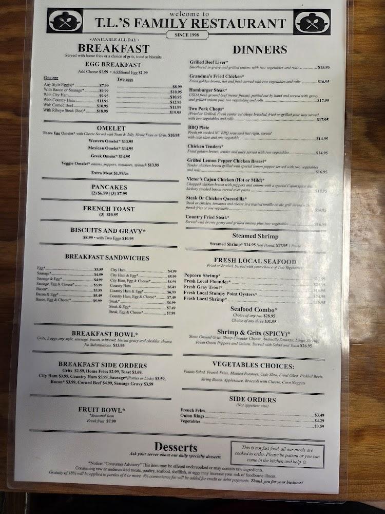 The menu at T.L.'s Family Restaurant features classic American comfort food with a Southern twist. Breakfast items, such as fluffy pancakes, country ham, and eggs, are particularly popular. For lunch and dinner, you can find delicious choices like fried chicken, shrimp, and homemade coleslaw. Signature items include fried scallops and grits, which always impress. The menu also offers lighter options for those seeking smaller portions or speedy bites. Desserts are a must-try, with locally sourced ingredients elevating their homemade appeal. Overall, the diverse menu pleases diners of all ages, making it an inviting place for every taste.